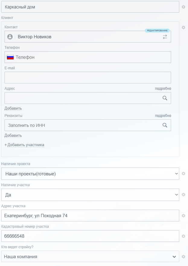 Откройте карточку сделки. Найдите поле «Наличие проекта». Нажмите – настроить.